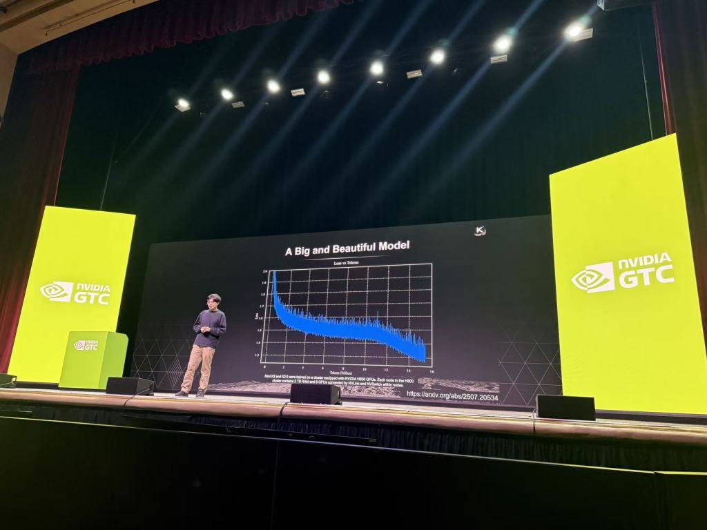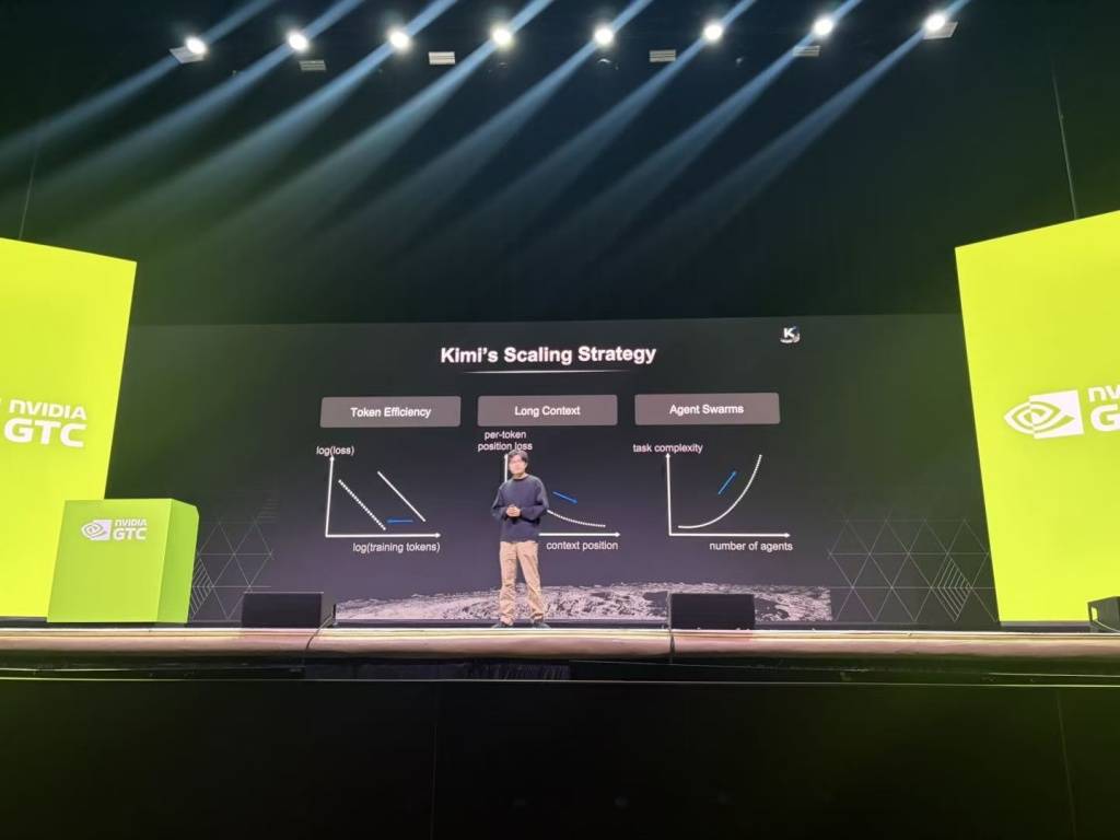 杨植(zhi)麟在2026GTC现场演讲。图片来源:月之暗面Kimi供应