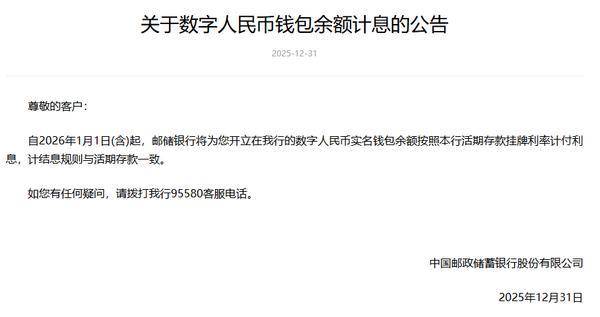 邮储银行发布公告称,自(zi)2026年1月1日(含(han))起(qi),邮储银行将为(wei)开立在该行的数(shu)字人民币(bi)实名钱包余额按照该行活期存款挂牌利率计付利息,计结息规则与活期存款一致(zhi)。