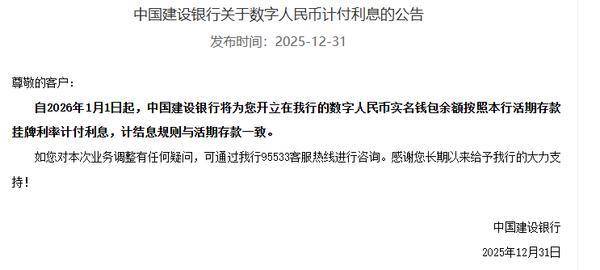 建设银行发布公告称,自(zi)2026年1月1日起(qi),建设银行将为(wei)开立在该行的数(shu)字人民币(bi)实名钱包余额按照该行活期存款挂牌利率计付利息,计结息规则与活期存款一致(zhi)。