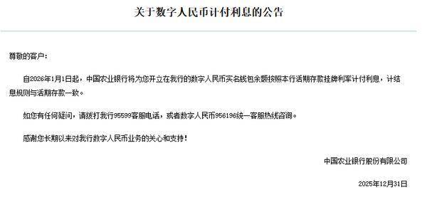 农业银行发布公告称,自(zi)2026年1月1日起(qi),农业银行将为(wei)开立在该行的数(shu)字人民币(bi)实名钱包余额按照该行活期存款挂牌利率计付利息,计结息规则与活期存款一致(zhi)。