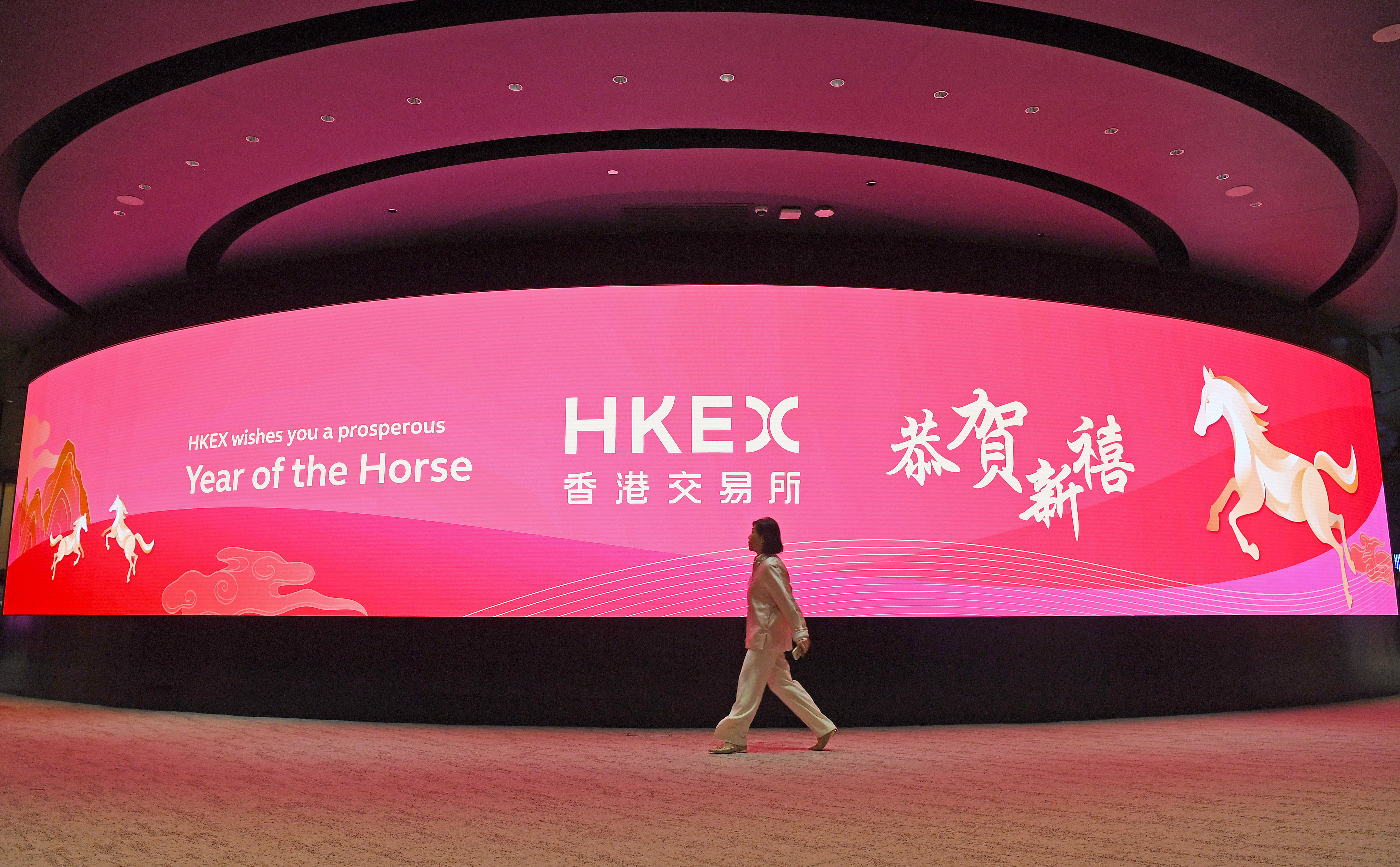 2月20日,一名女子从香港交易所电子显示屏前经过。当日,香港交易所农(nong)历马年(nian)首个交易日拉开帷幕。新华社记(ji)者 陈铎 摄(she)