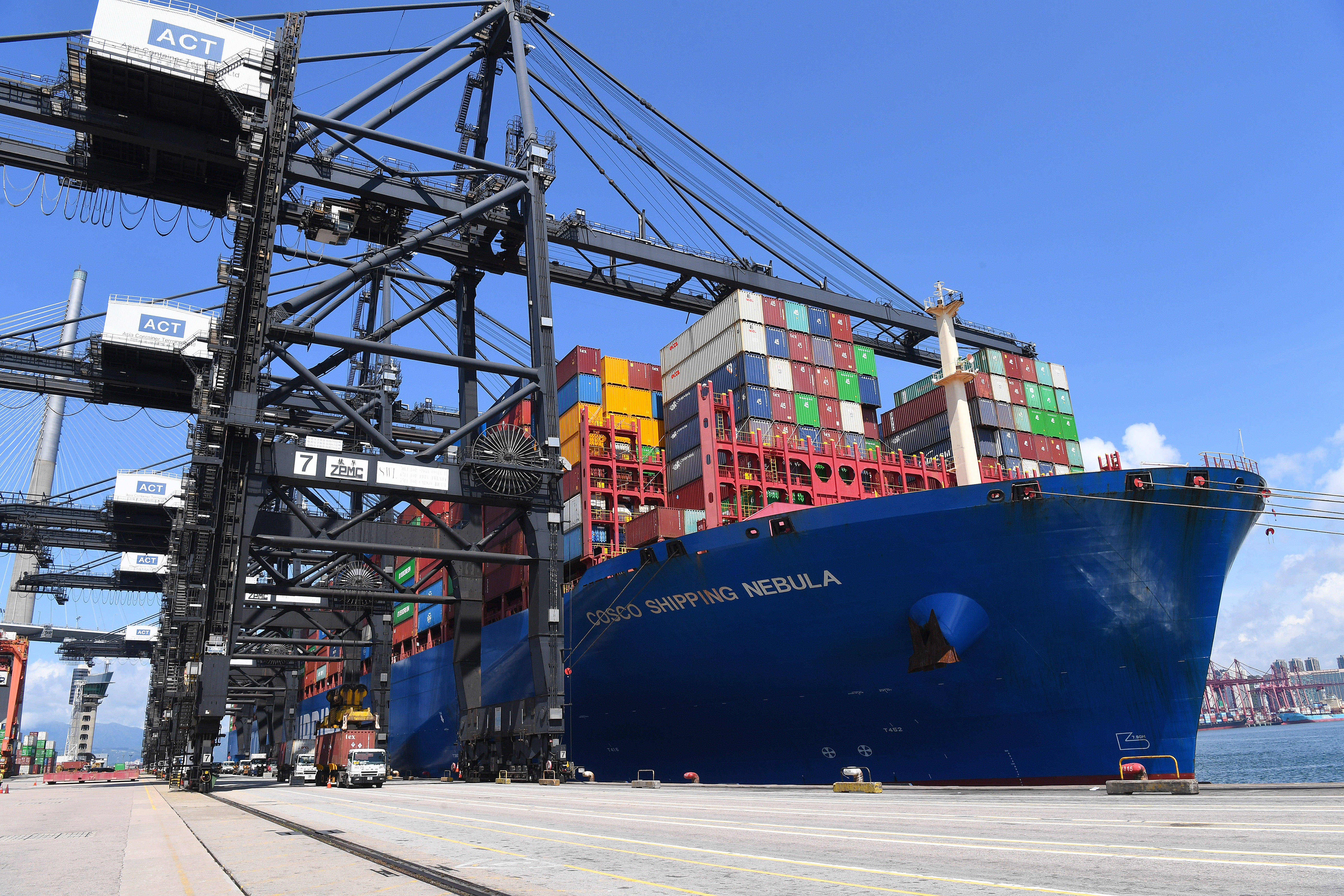 2025年(nian)5月22日,一艘集装箱货轮在香港货柜码头装货。新华社记(ji)者 陈铎 摄(she)