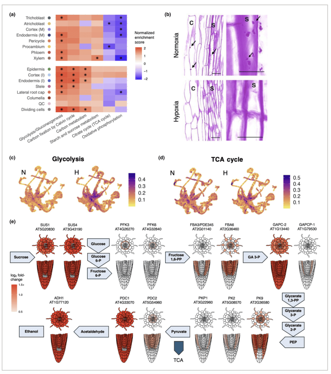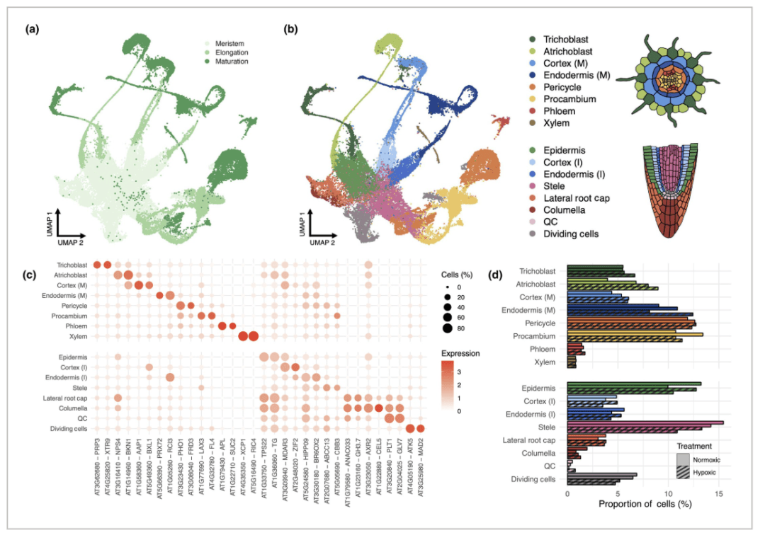 跟(gen)着环球(qiu)变暖导致弗成预测的洪水事件加剧,理解植物根细胞如何感知和相应氧气(qi)匮(gui)乏(缺氧)相当紧张。以往研(yan)究多(duo)存眷全体器官或特定地区对(dui)缺氧的相应,但由于根系由多(duo)种处(chu)于不同发育(yu)阶(jie)段的细胞类型构成,且氧气(qi)扩散受限大概导致根内构成缺氧焦点,因此不同细胞类型对(dui)缺氧的相应存在明(ming)显差别。传(chuan)统(tong)的批量(liang)转录组学方法难以剖析这种细胞类型特异性的相应机制。只管已有研(yan)究通过分离特定细胞类型探索(suo)了低氧胁(xie)迫下的转录和翻译变更(geng),但全面、高分辨率地展(zhan)现根尖所有细胞类型在缺氧早期阶(jie)段的转录组重塑仍然是一个(ge)挑战。