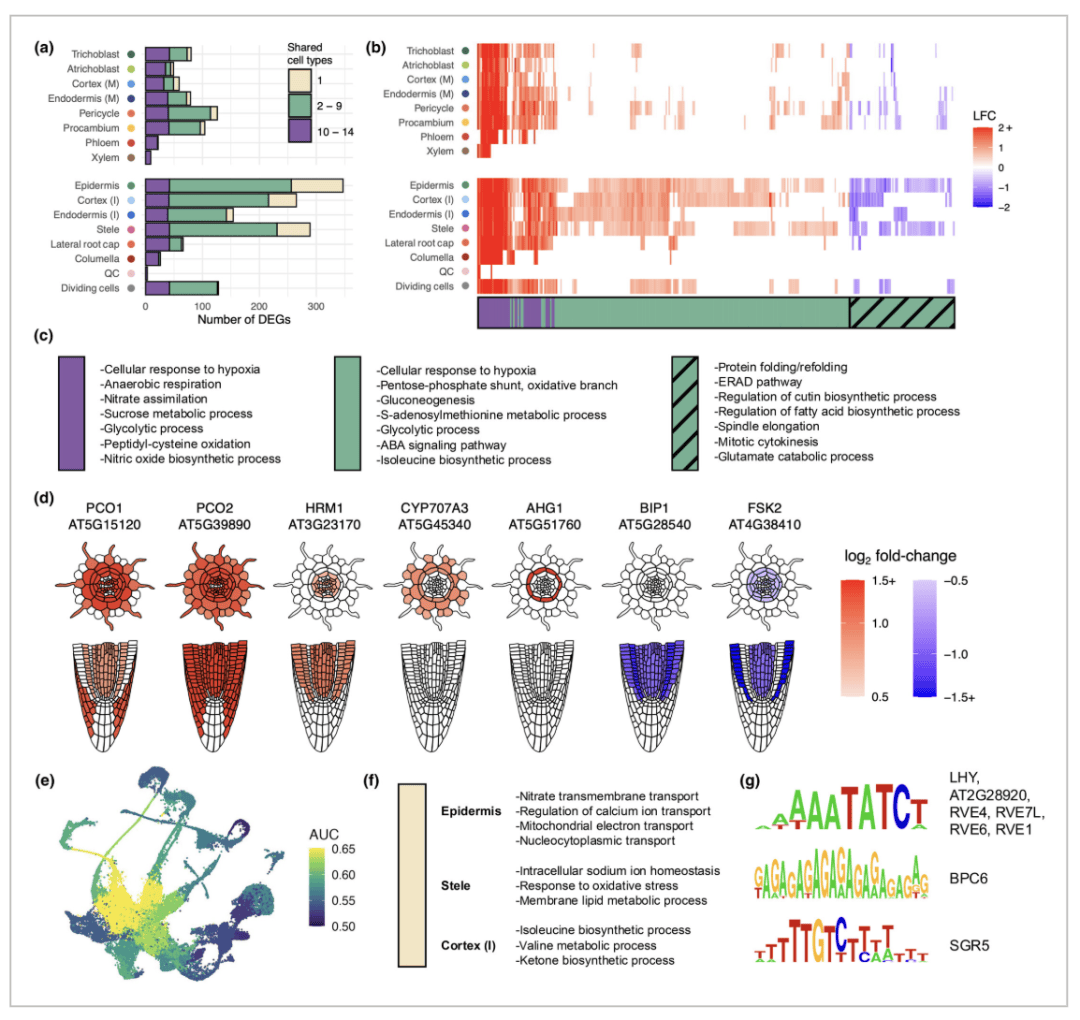 该研(yan)究首先通过单细胞核RNA测序技术,阐明(ming)了经由4小经常氧(21%氧气(qi))或低氧(4%氧气(qi))处(chu)理的拟(ni)南(nan)芥幼苗(miao)根尖细胞的转录组。研(yan)究发现,缺氧诱导了广泛的转录组重编程,这种变更(geng)在分生区细胞(运动中心除外)中最为明(ming)显。