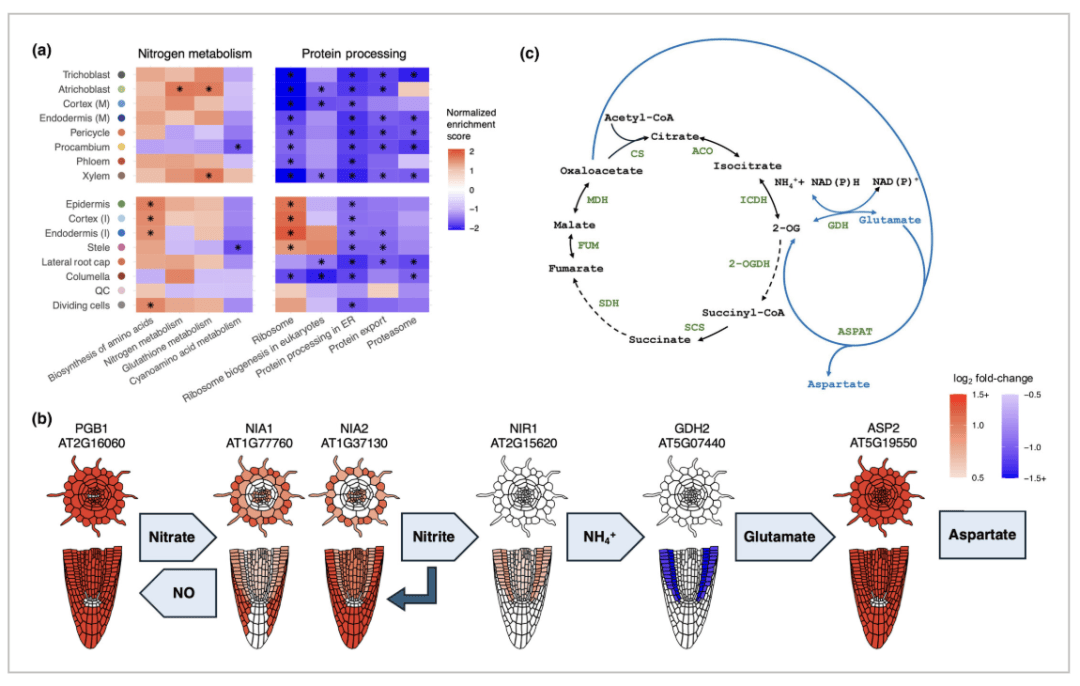 然后,研(yan)究进一步通过代谢通路富(fu)集阐明(ming)和枢纽基因表达(da)图谱绘制,发现了碳氮代谢的协同重塑:碳代谢方面,糖酵(jiao)解/糖异生通路在多(duo)数细胞类型中被明(ming)显上调,淀粉储备下落,以增加碳水化(hua)合(he)物供给来驱动发酵(jiao)途径产生能(neng)量(liang);氮代谢方面,硝酸盐(yan)和亚硝酸盐(yan)还(hai)原酶基因普遍上调,其产物一方面大概通过植物球(qiu)蛋(dan)白-一氧化(hua)氮循环来维持能(neng)量(liang)生产和低落细胞还(hai)原水平,另一方面大概通过天(tian)冬氨酸氨基转移(yi)酶的上调来绕过受抑制的三羧酸循环。